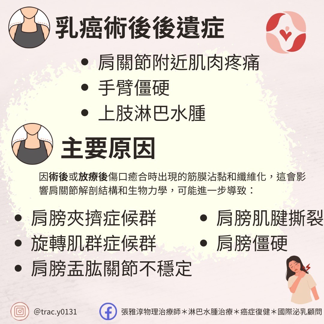 根據Julie et al. 2021年的研究,約有33%的乳癌術後患者會遇到肩部活動受限或慢性疼痛。️