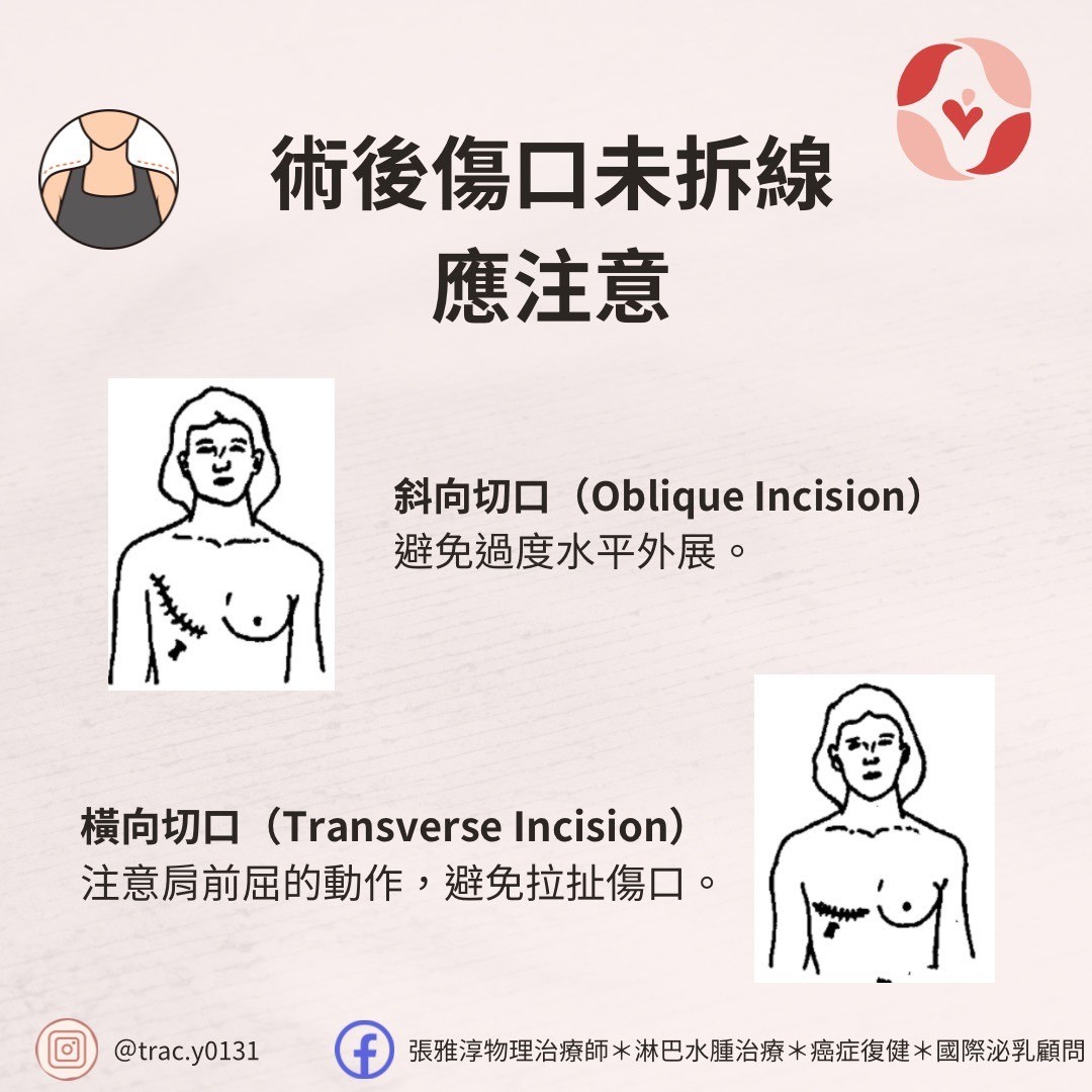 橫向切口(Transverse Incision):注意肩前屈的動作,避免拉扯傷口。
