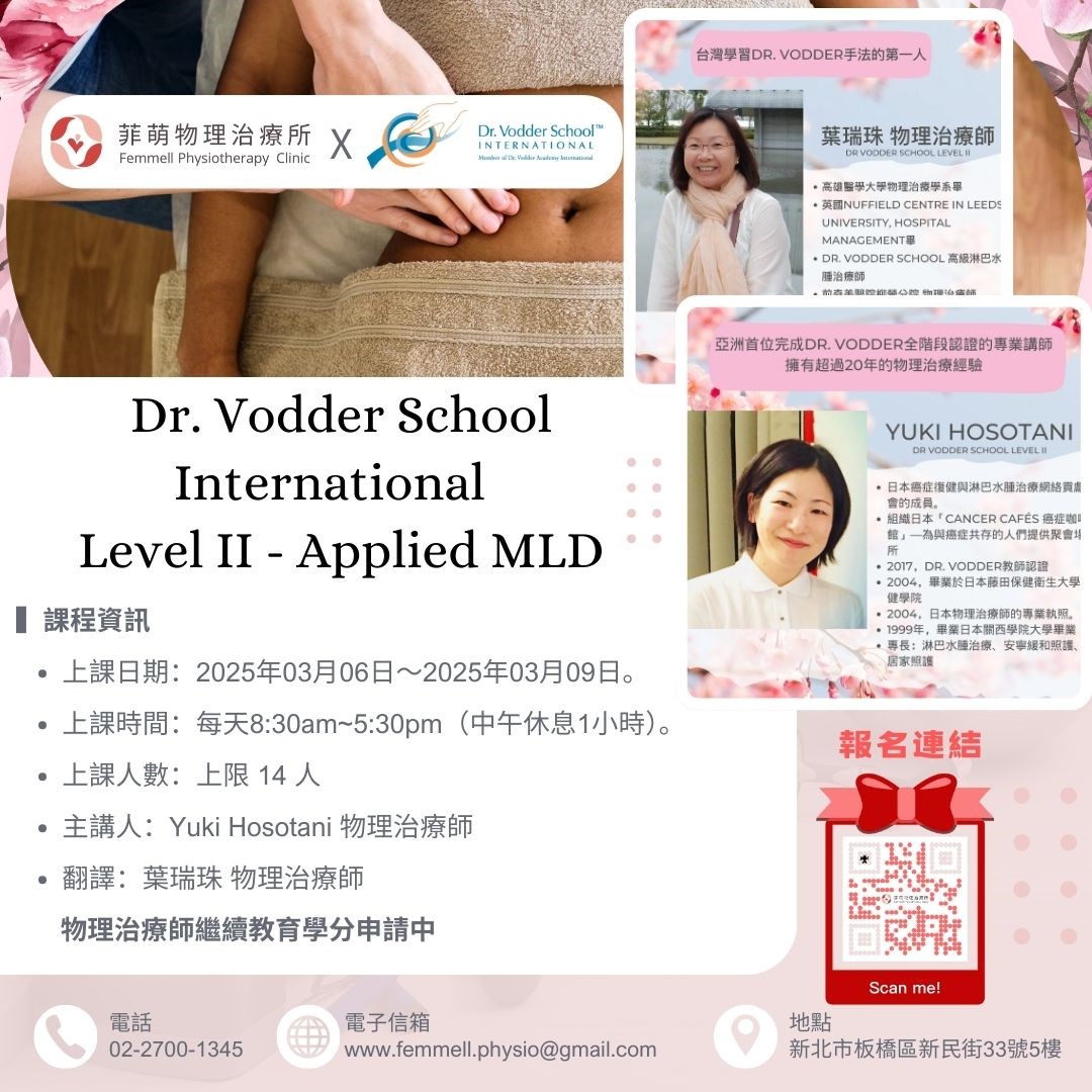 Level II課程深入教授專業進階淋巴引流治療技術,專門設計來改善淋巴系統功能並緩解多種病症引起的腫脹。學員將學習實施進階MLD技術,掌握廣泛臨床症狀的治療,如關節疾患、深層腹部問題、頭顱區症狀及專業口內技法。課程還包括如何處理頸部扭傷、燒傷、偏頭痛等複雜症狀,以及特定骨骼肌肉系統的疾病,如踝關節旋後創傷和膝關節置換術。完成課程並通過實際操作的考核後,學員將獲得國際認可的Dr. Vodder® MLD Level II認證,這不僅提升技術能力,也為專業生涯提供寶貴的價值。